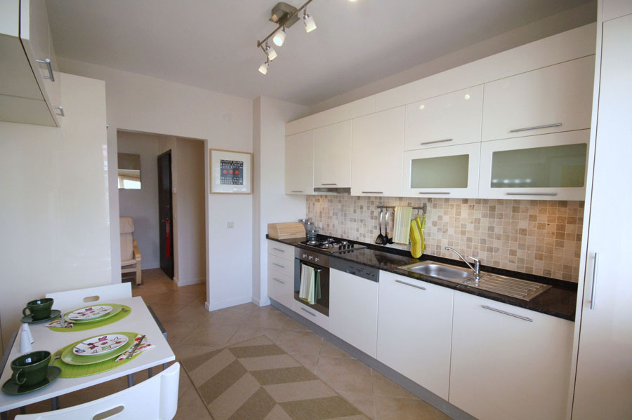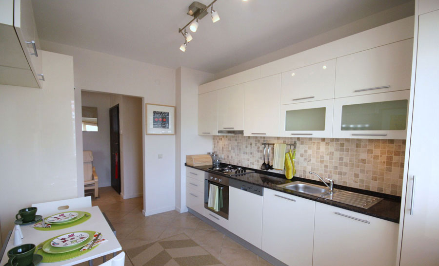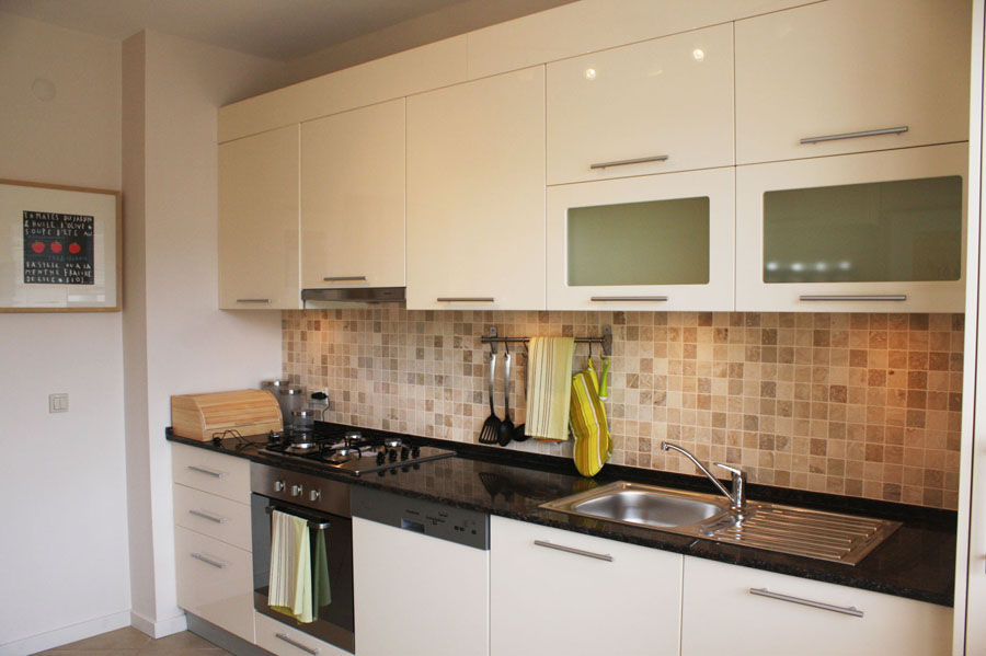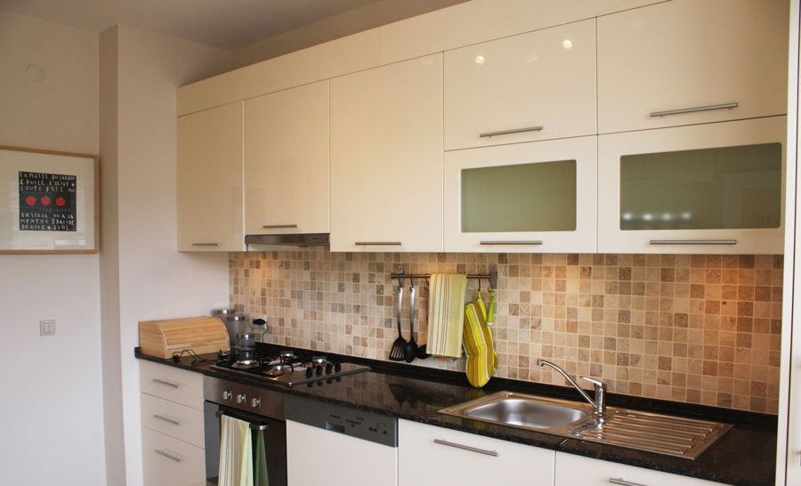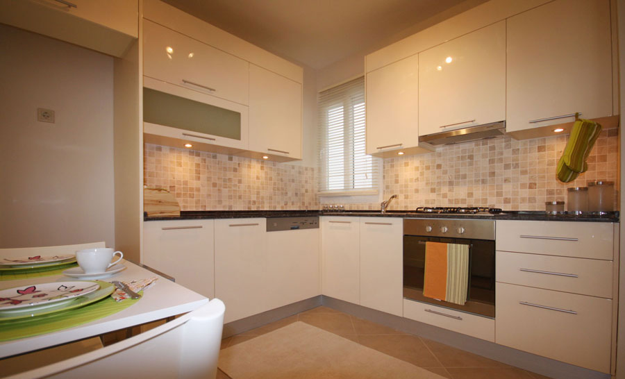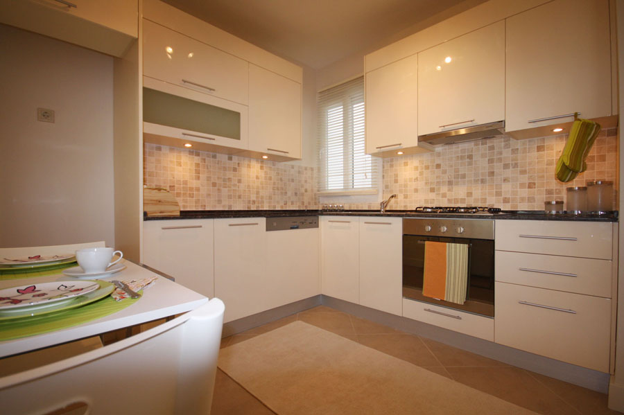 Spot ışıklandırma, membrant kapaklar, granit tezgah, tezgah üstü traverten duvar kaplaması...